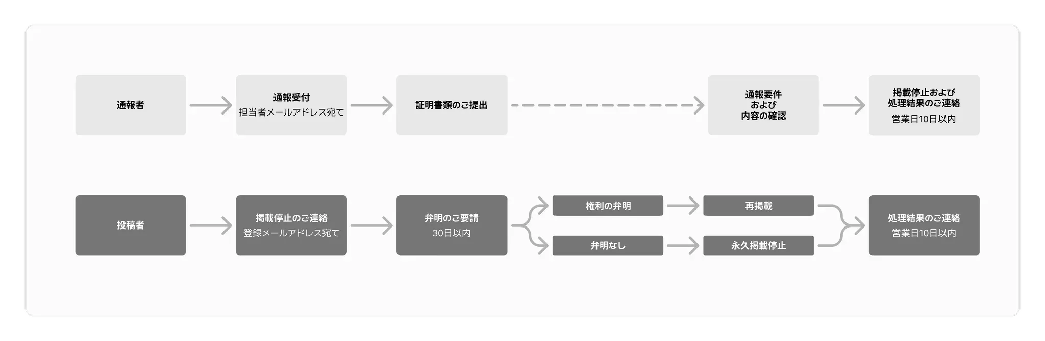 投稿者は自身の投稿物に提起された権利侵害通報に誠実に答える義務があります。投稿者が期限内に弁明を提出しない、または弁明手続きに不誠実に臨む場合には、権利侵害判断と無関係に投稿物が永久掲載中止になる可能性があります。